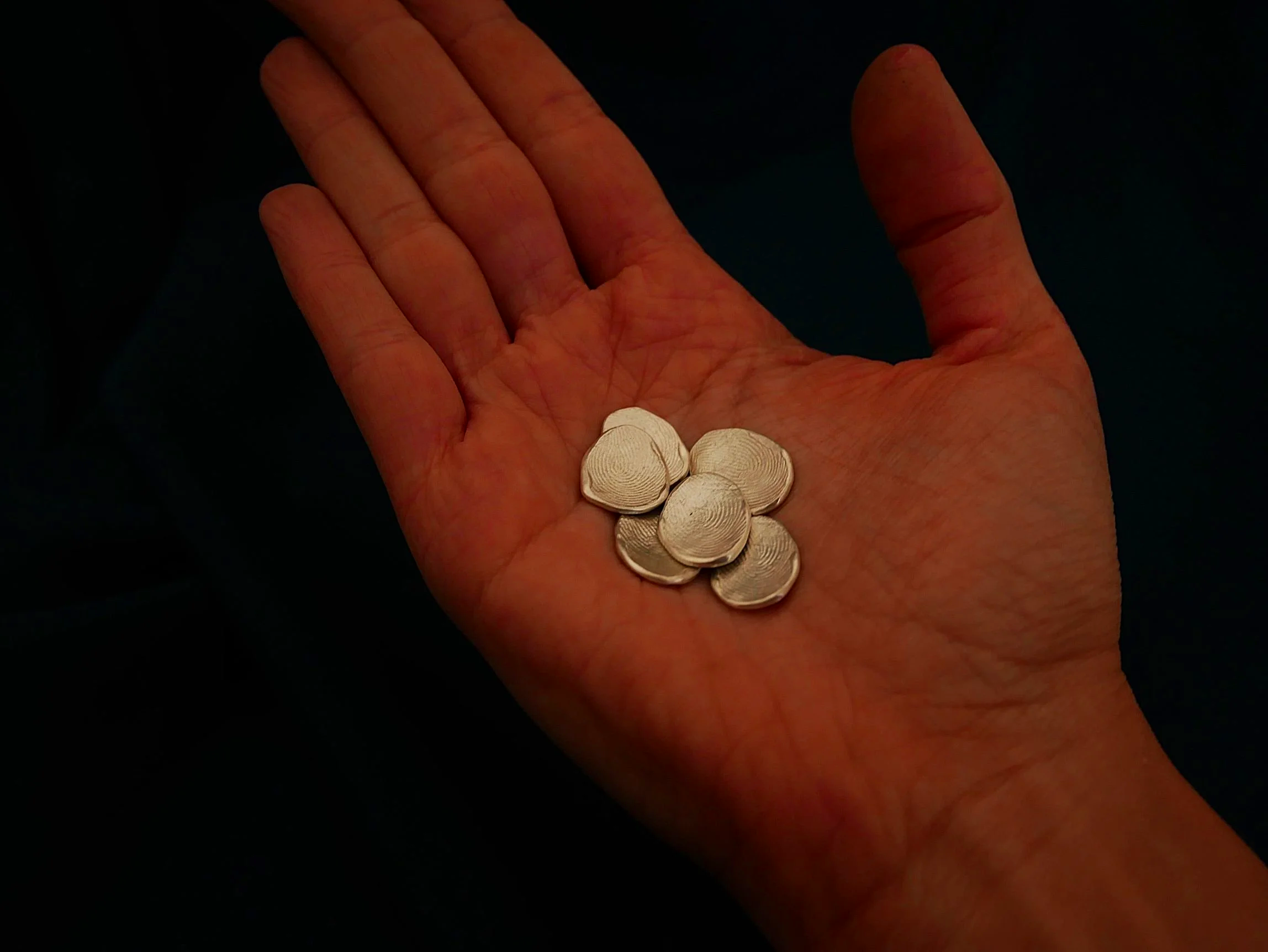 Des pièces que je fabrique en recyclant mes chutes d’argent. Par fusion du métal, mes chutes se transforment sous mon chalumeau en formes abstraites et poétiques.